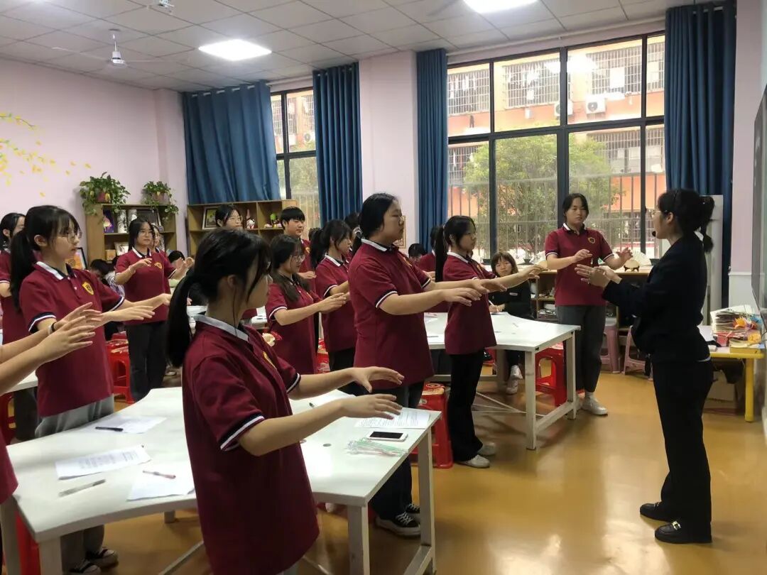 文艺老师首先从指挥的手势来进行讲解示范,不同音乐风格的歌曲指挥时点也是不同的。并结合学生合唱《映山红》曲谱为学生进行现场指导,让同学们通过亲身实践,知识领会更深刻,指挥动作更到位。